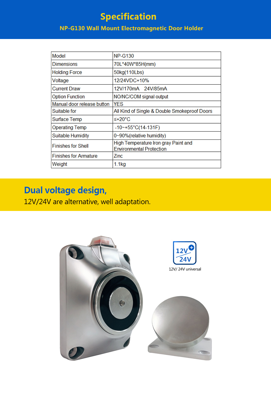 NP-G130 Wall Mount Door Holder(Floor Mount Bracket for options) takes the latest iron gray paint to match fire door. Low power consumption and 12V/24V dual voltage selective for energy efficiency. Up to 50kg holding force keeps fire door opened and it close automatically when fire happens, for fail safe function. It has manual door release button that can close door by hand. With built-in MOV reverse current protection, few residual magnetism to ensure fire exits is unimpeded. The movable plate installed on fire door suits for different installation angle. Catch plate and main part takes zinc alloy which is heat resisting and wear resisting. Professional anti-residual magnetism design ensures highest security. This professional designed secure and low power consumption electromagnetic door holder suits for various fire door, it is widely used in commercial and industrial area like: shopping mall, residential building, office building, hospital, school, factory, hotel etc. NP-G130 Wall Mount Electromagnetic Door Holder also called electric door holder, fire control door holder.